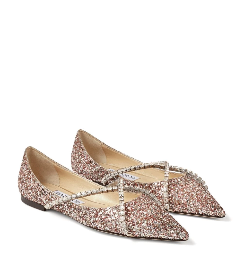 Subtlety and sparkle collide in the Genevi flats from Jimmy Choo. While the label is renowned for its elegant pumps, it proves with this pair that the absence of a sharp stiletto neednβt dial down the glamour. Sprinkled in iridescent glitter, the pair has a sleek pointed profile thatβs accented with strap-like crystal configurations, providing a weekend-ready style with the brandβs signature flourish.