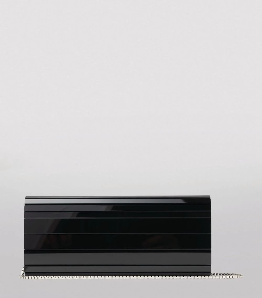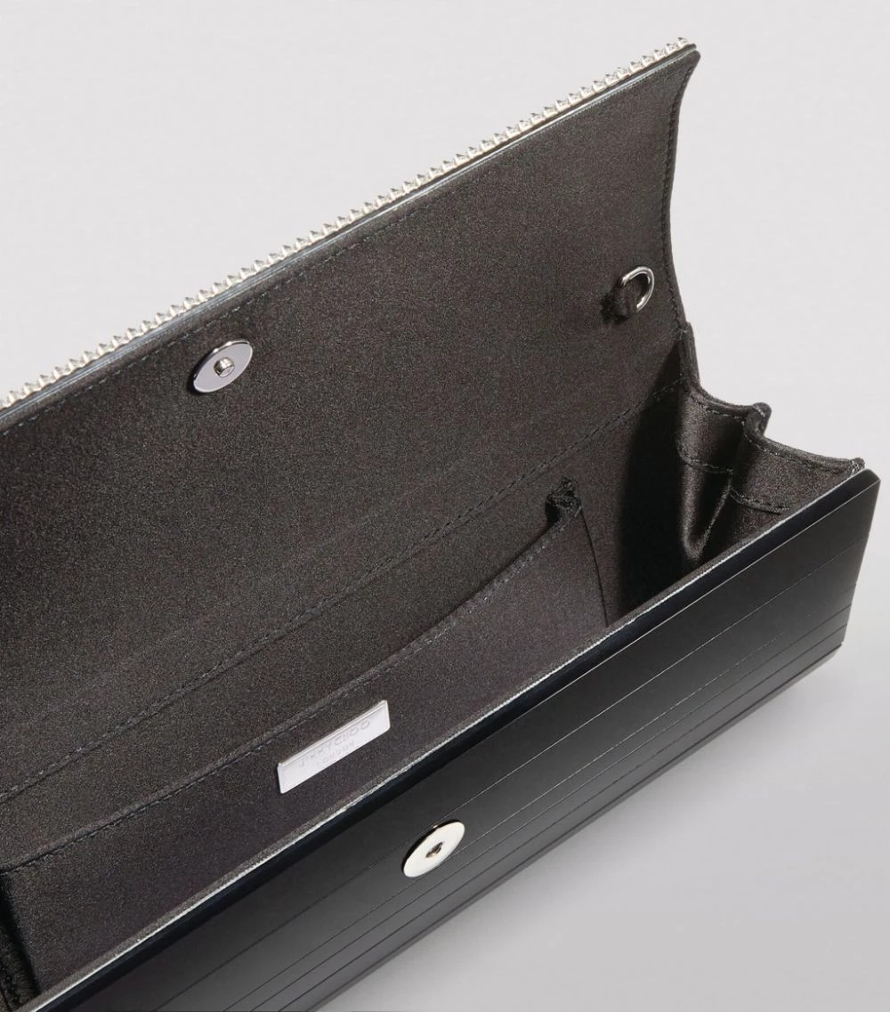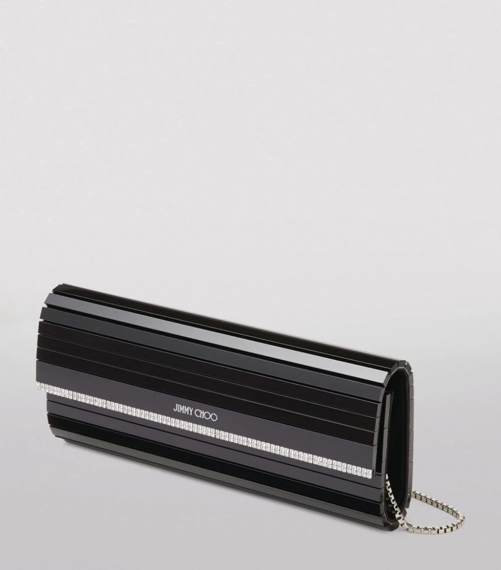 The ultimate party sidekick, the panelled Sweetie clutch from Jimmy Choo is trimmed with a row of glittering crystals. Suspended from an elegant chain strap, the Italian-made piece is finished with polished silver-tone hardware and an embossed logo. Offset the sparkling design against a classic LBD.