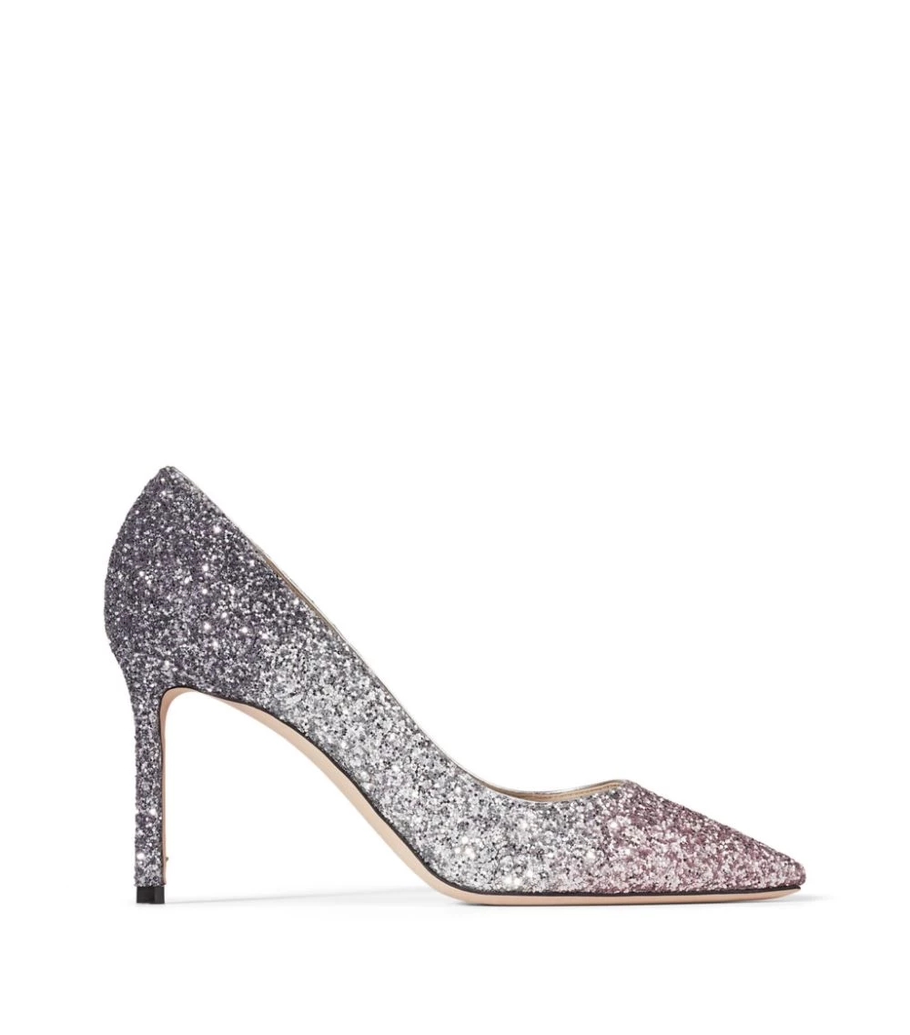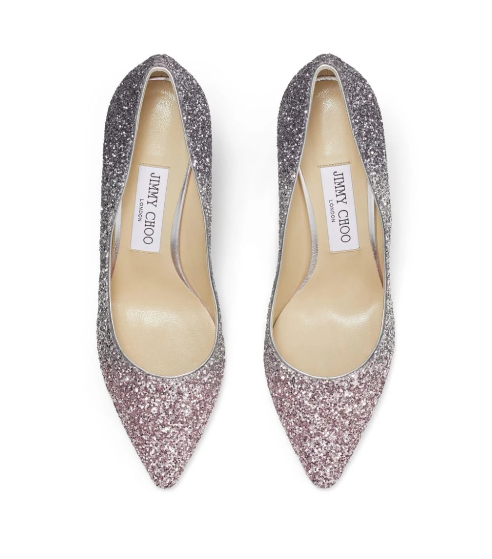 Imagined in glistening ombrΓ© glitter for the new season, Jimmy Choo’s Romy pumps are a signature style for the label, with a pointed toe and slim heel. Classic and versatile, they will lend a touch of glamour to dressed-down days or complement evening dresses with femininity.