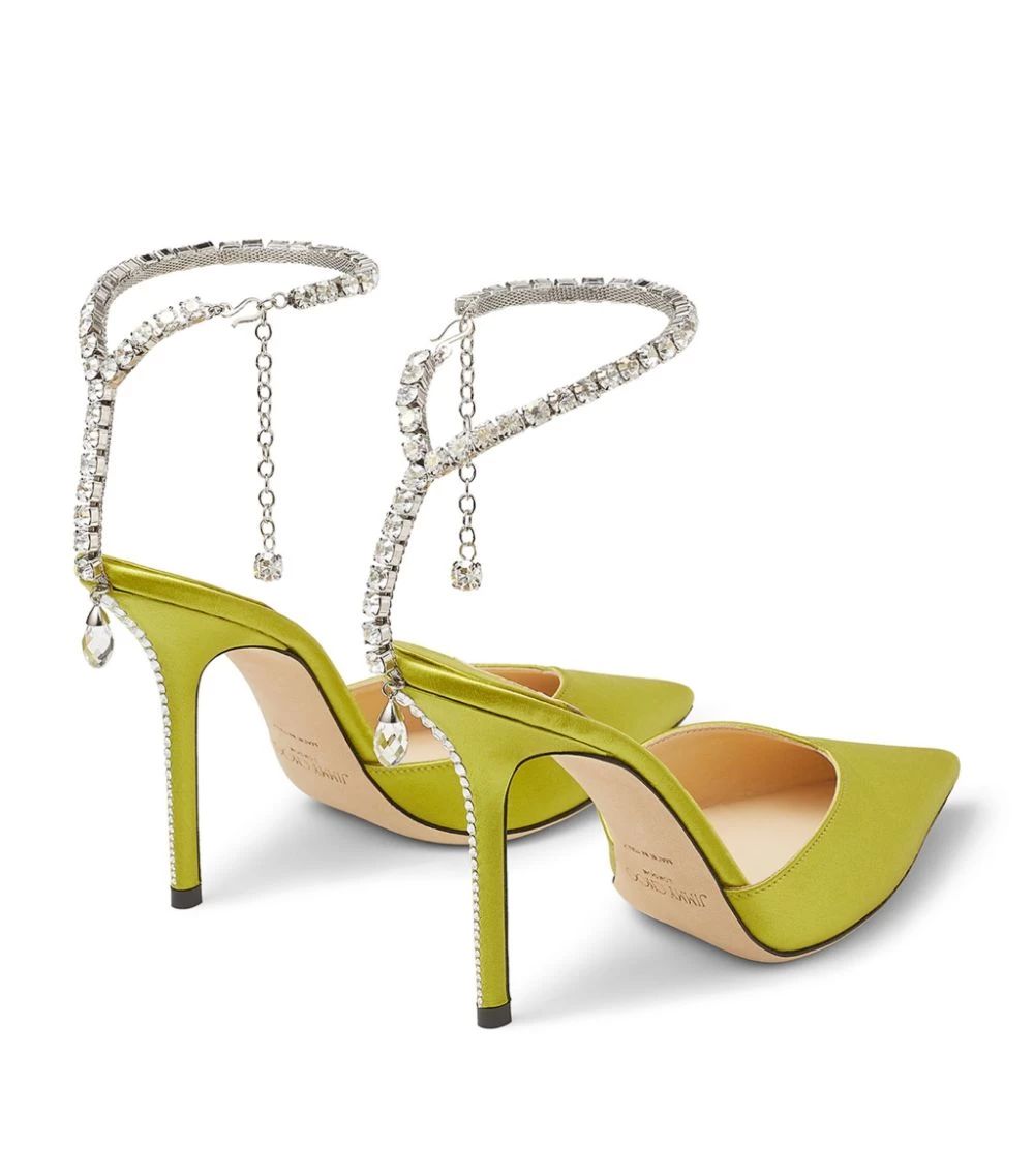 Adorned with a decadent crystal ankle strap that rivals sparkling jewels, the Saeda pumps by Jimmy Choo are the epitome of glamour. Crafted with a pointed toe thatβs cloaked in satin, they boast a lavish, barely-there profile that works to elongate the leg when paired with sculpted evening gowns or tailored trousers.