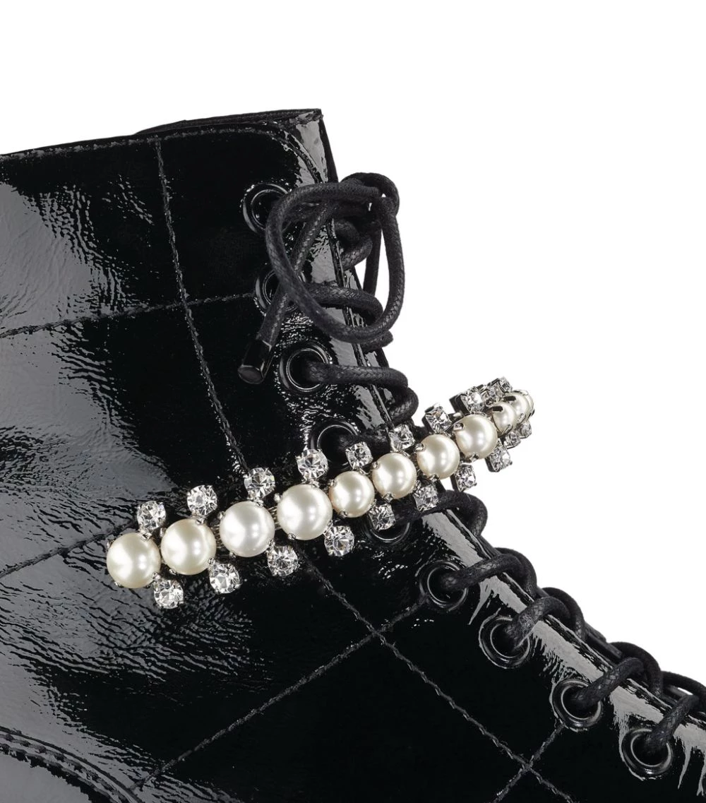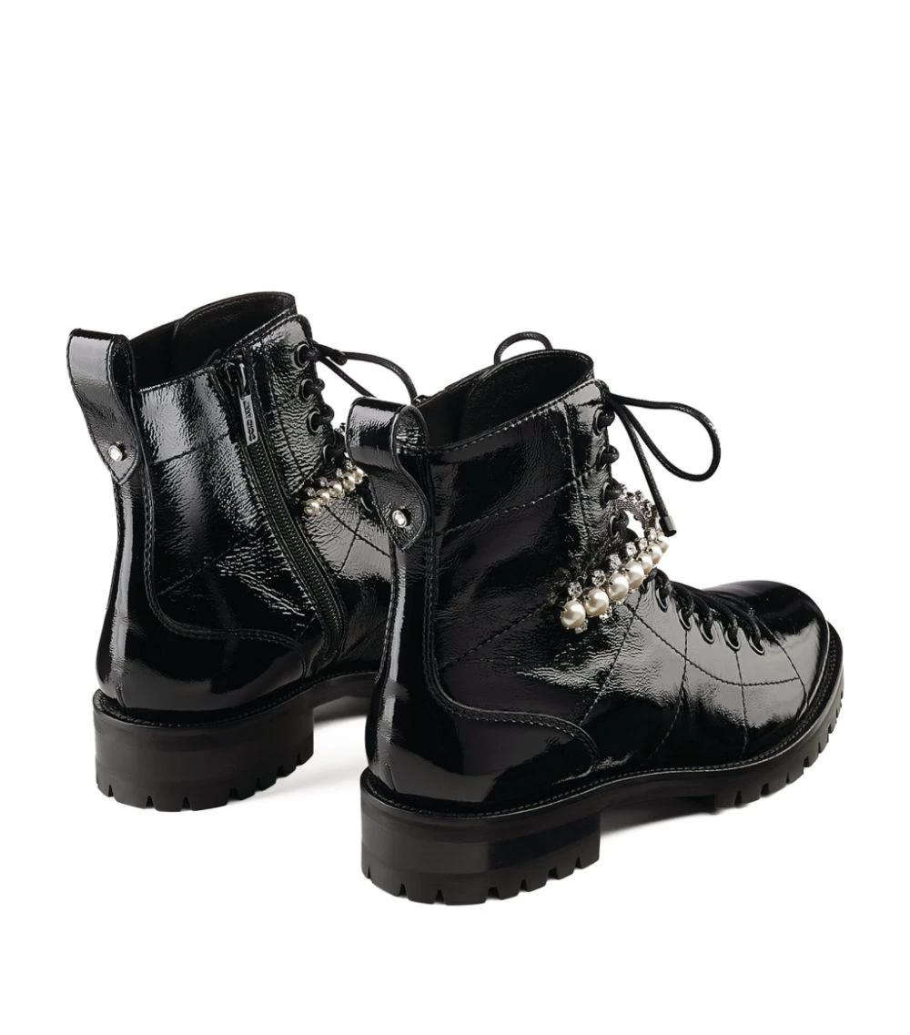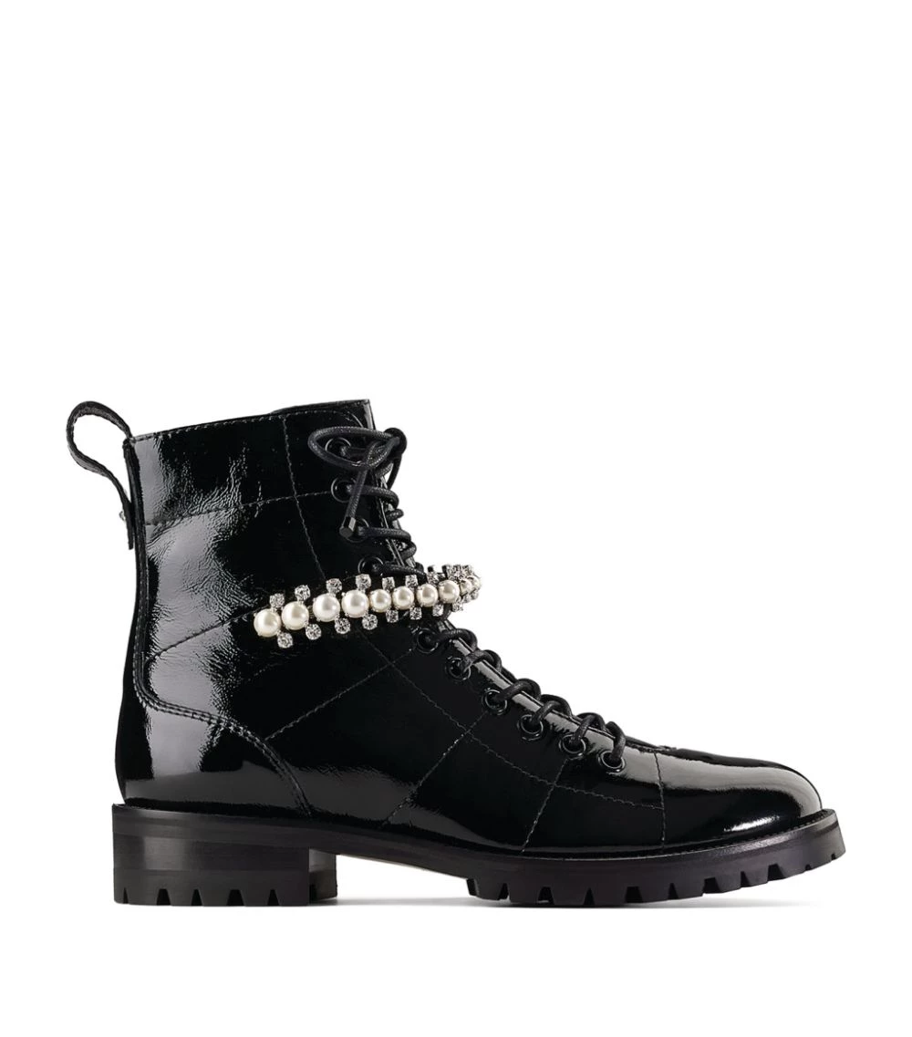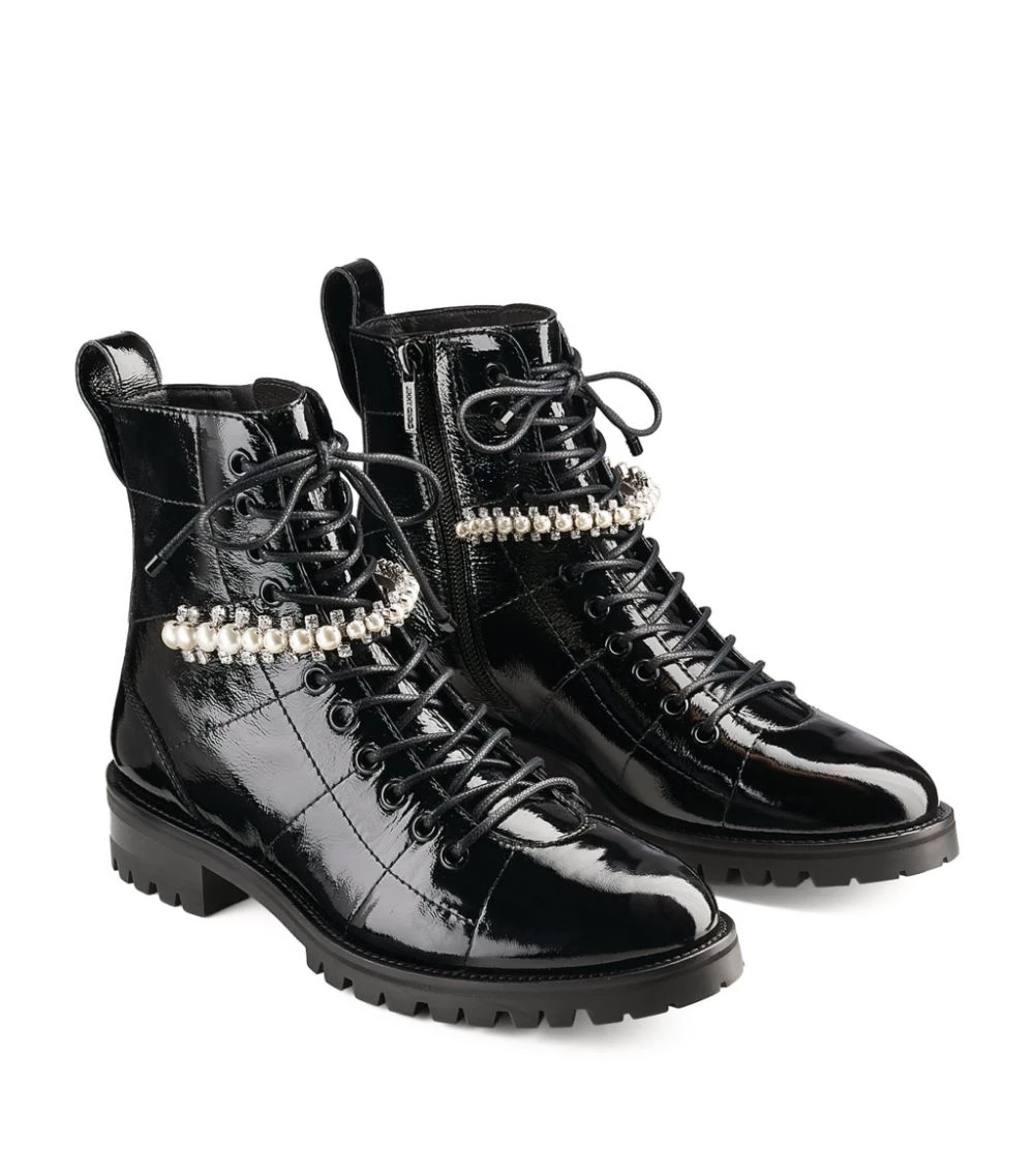 Updated with a gleaming patent finish thatβs sure to turn heads, Jimmy Chooβs Cruz boots exhibit a signature feminine take on the androgynous combat silhouette. The ankle-high pair are given a glamorous finish β synonymous with the British House β in the form of pearlescent studs and crystal embellishments to the front.