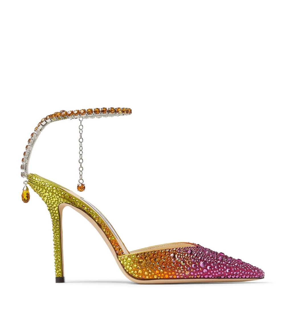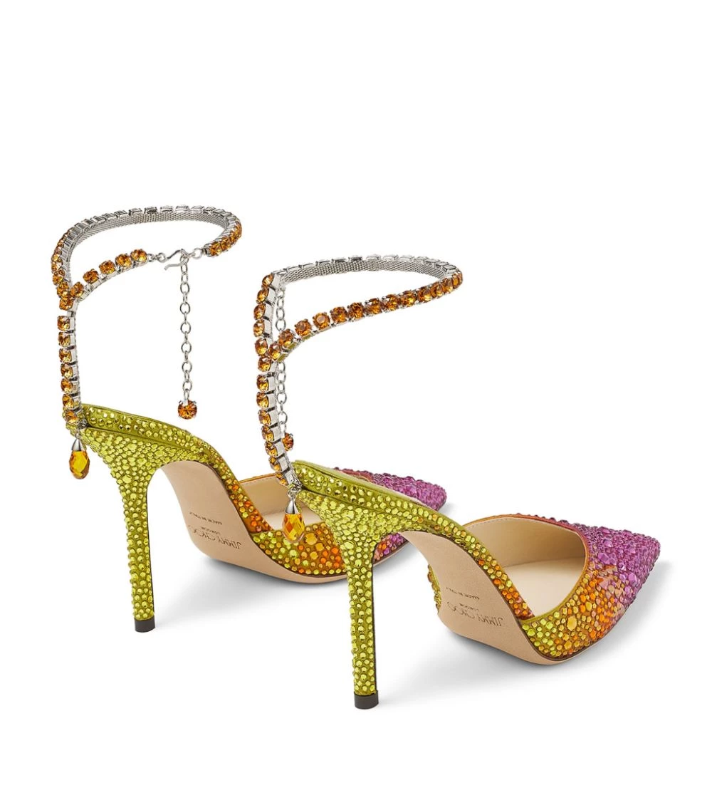 Adorned with a decadent crystal strap that rivals sparkling jewels, the Saeda pumps by Jimmy Choo offer the epitome of glamour. Crafted with a crystal-embellished pointed toe, they boast a lavish, barely-there profile that works to elongate the leg when paired with sculpted evening gowns or tailored trousers.