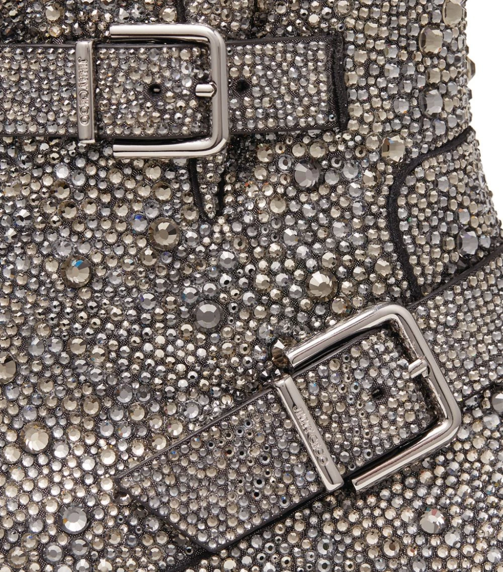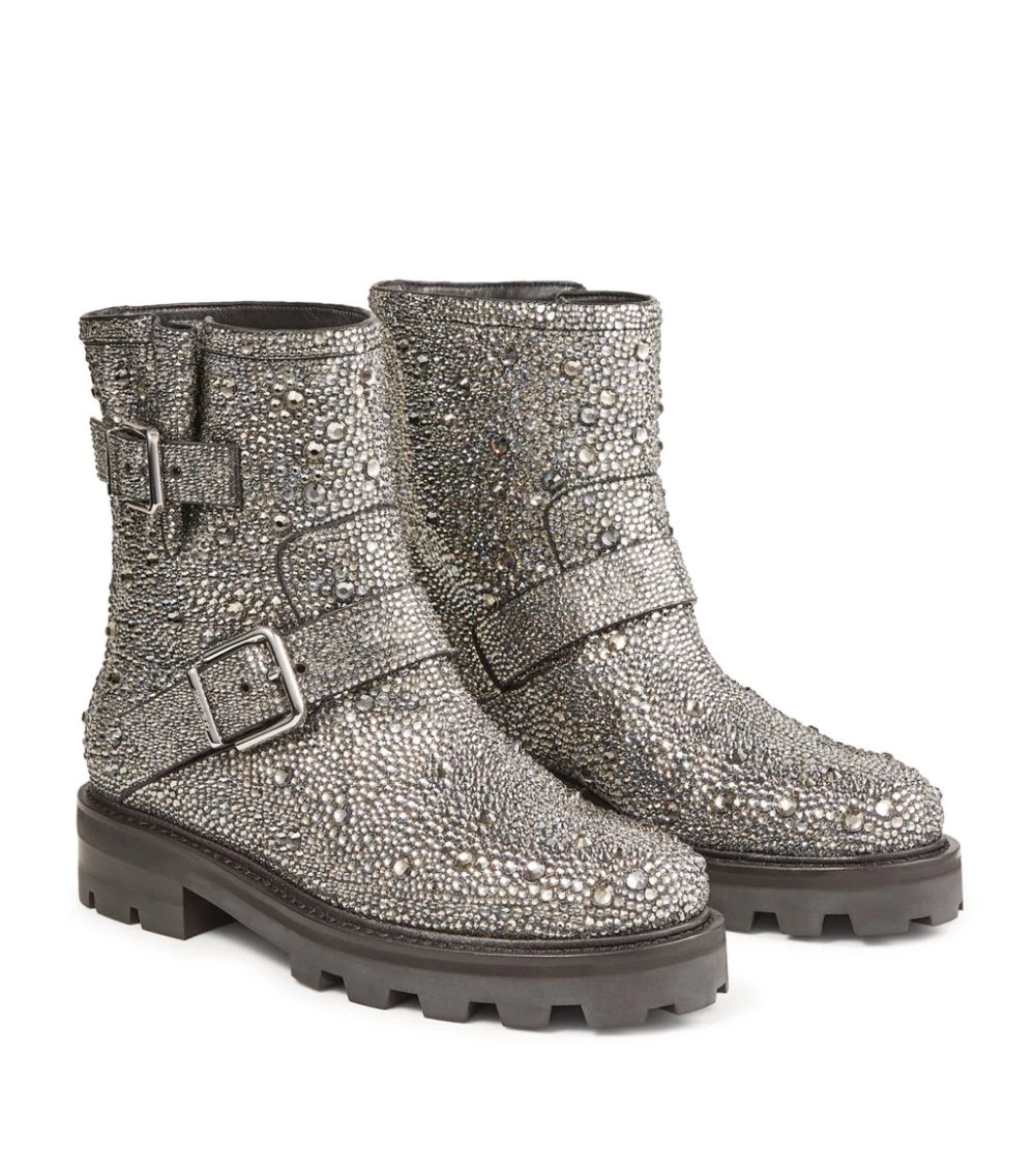 An update to one of Jimmy Chooβs most covetable pairs of shoes, the Youth II biker boots are a versatile addition to your collection. Set upon a cleated rubber sole, the boxy ankle-high silhouette is crafted in crystal-embellished leather and is finished with a pair of gleaming buckles and the iconic interlocking monogram detail to the reverse.