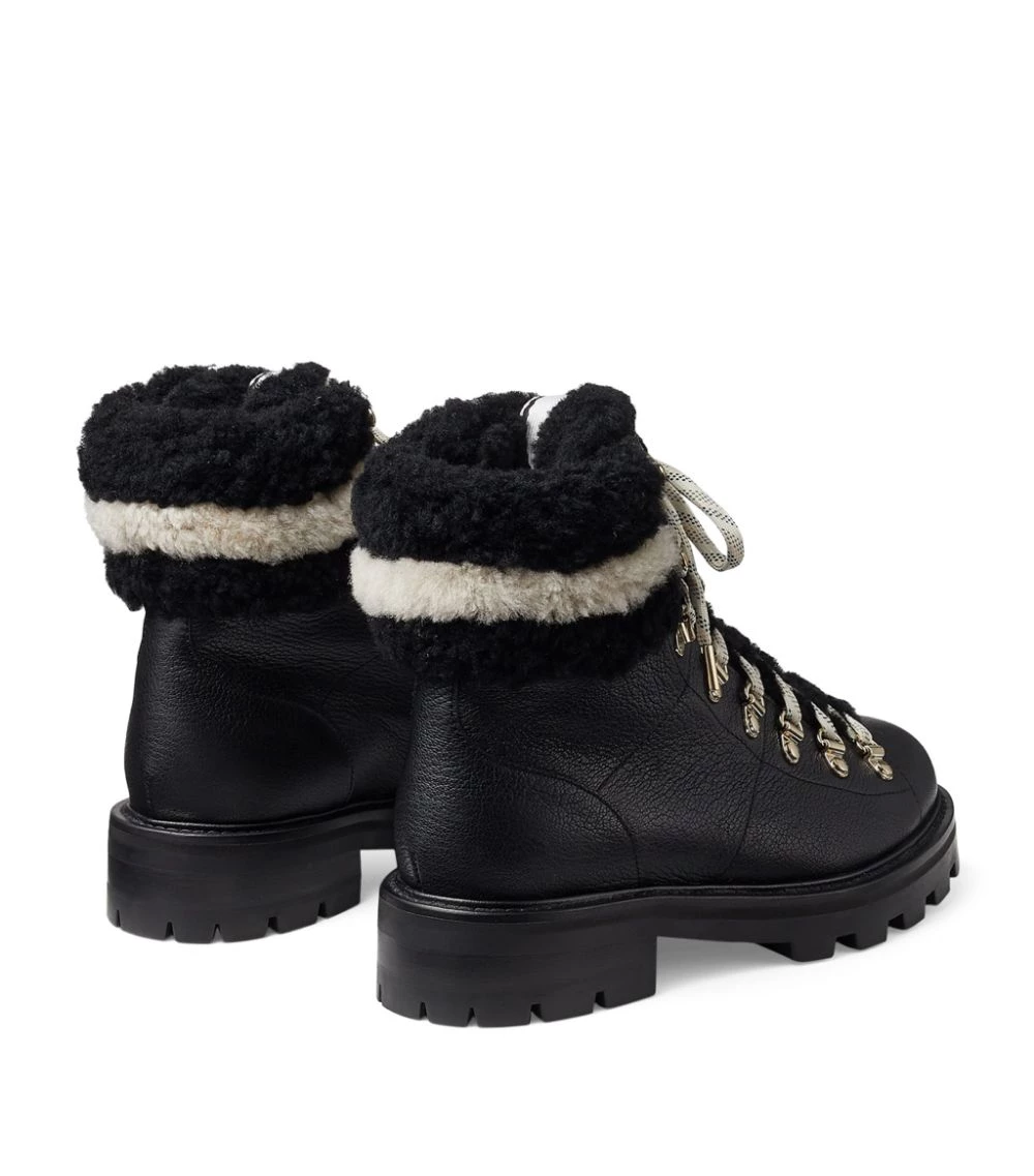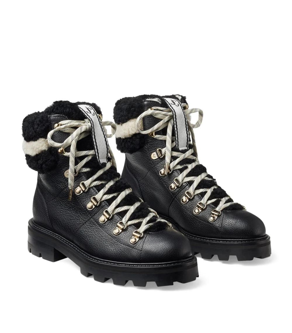 Updating a biker silhouette with softer lines and premium materials, the Eshe boots from Jimmy Choo are crafted in supple leather for an authentic look that offers a durable finish. Punctuated with classic lace-up fastening, the style is completed with lavish shearling trims at the ankle, securing the look with a glamorous touch.