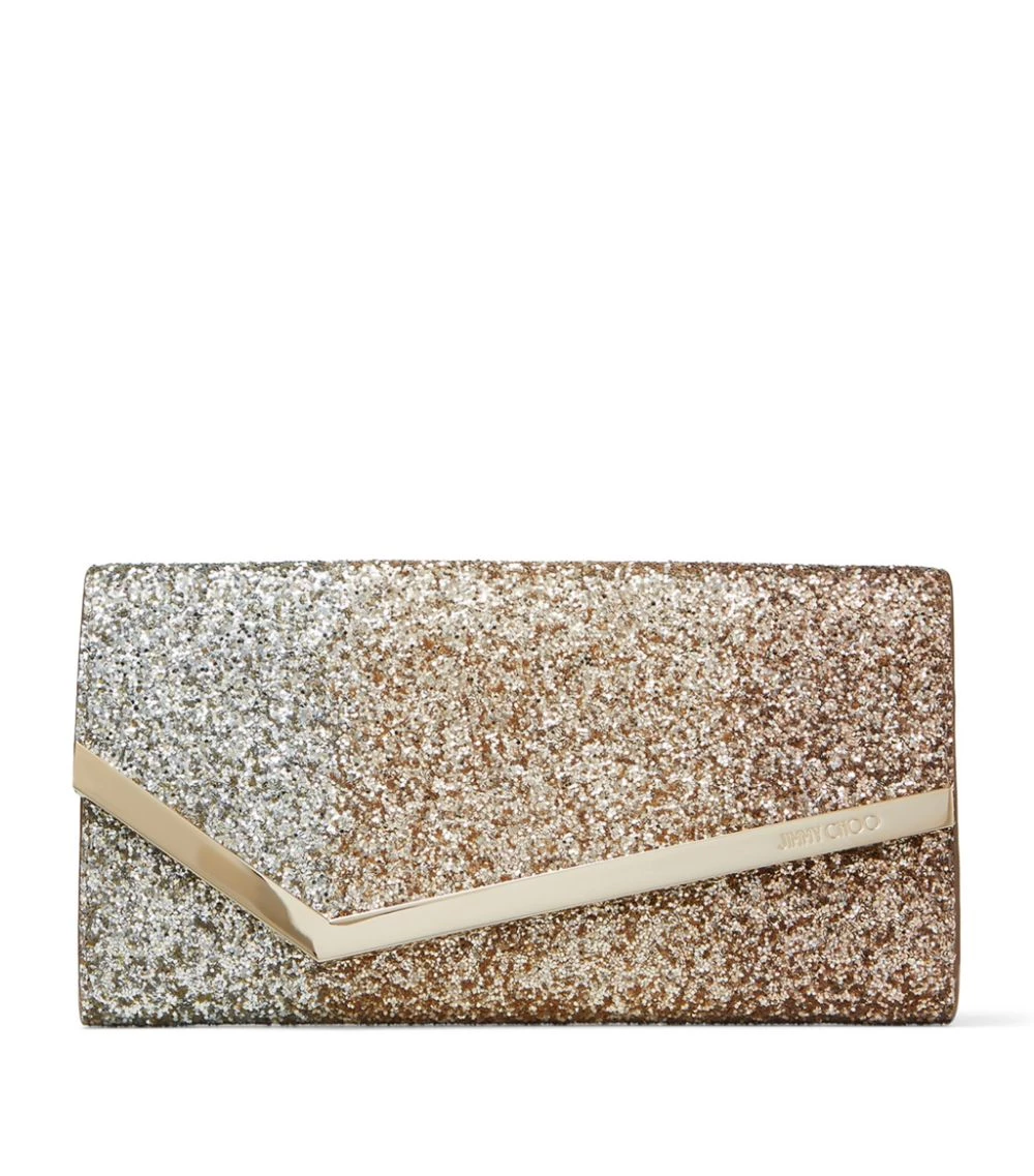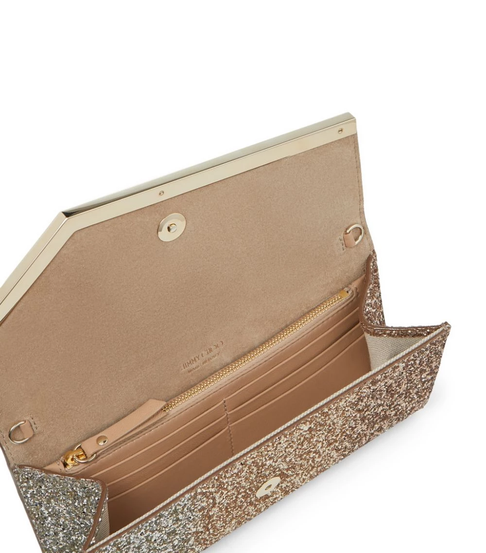 Inject instant elegance into evening ensembles with the Jimmy Choo Emmie clutch in iridescent glitter. Crafted in astructured and compact silhouette with an asymmetric flap front, it opens to reveal a smooth interior with practical card slots and a zipped pouch to keep money and essentials to hand.